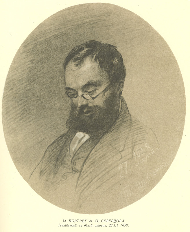 М. О. Сєверцов був близько знайомий з Шевченком з кінця жовтня 1858 р. Про зустрічі М. О. Сєверцова з Шевченком у Петербурзі пише його невістка — Л. Б. Сєверцова: «Он хорошо знал Мея, Майкова, Полонского, особенно же близко Н. Щербину и Тараса Шевченко, тогда только что вызволенного из ссылки благодаря неустанным хлопотам Толстых. Хорошо знал он и известного трагика Айру Олдриджа, с которым встречался и у Толстых, и у Шевченко, писавшего в своей мастерской портрет Олдриджа. В 1859 г. Т. Шевченко написал небольшой, но прекрасно выполненный портрет Николая Алексеевича, всю жизнь висевший у Алексея Николаевича в кабинете над его письменным столом» (Л. Б. Сєверцова, Алексей Николаевич Сєверцов, М. — Л., АН СССР, 1946, стор. 36).