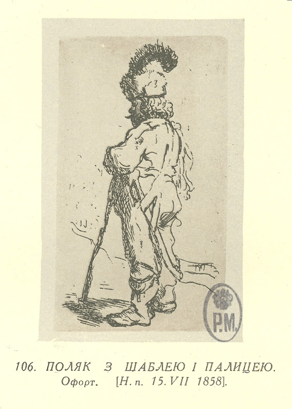 106. Поляк з шаблею і палицею. Папір, офорт 7,8 × 4,4; (8,5 × 5,4). [Пб.]. [Н. п. 15.VII 1858].