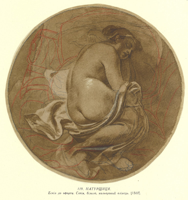 119. Натурщиця. Ескіз до офорта. Тонований папір, сепія, білило, кольоровий олівець (23,7 × 23,7). [Пб.]. [1860].