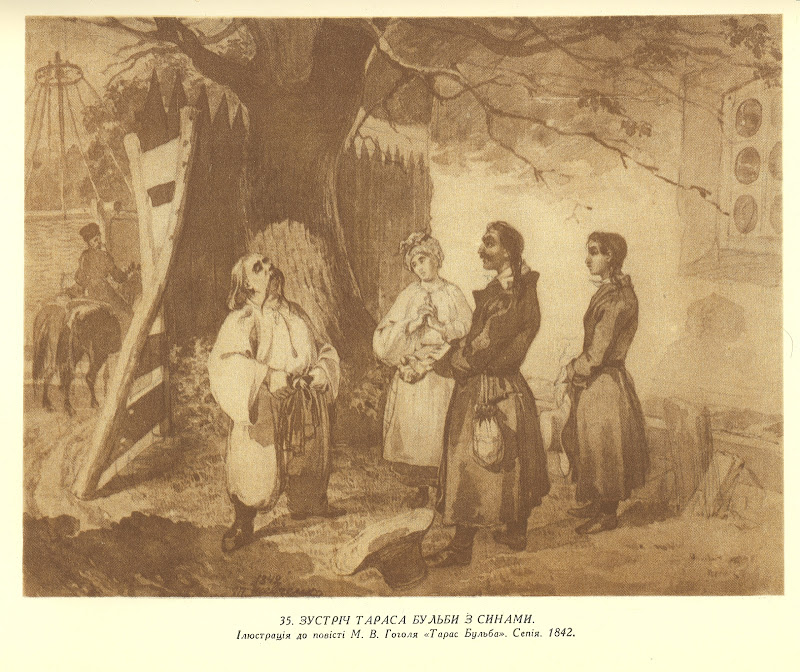 Це перша ілюстрація до повісті Гоголя «Тарас Бульба». Відомості про неї як про власність М. Д. Бикова (Петербург) вперше подано в «Киевской старине» (К., 1888, июнь, стор. 82) з позначенням, що цей малюнок після розпродажу збірки зник. С. Є. Раєвський помилково датує малюнок 1840 р. («Життя і творчість художника Тараса Шевченка», X., 1939, стор. 44).