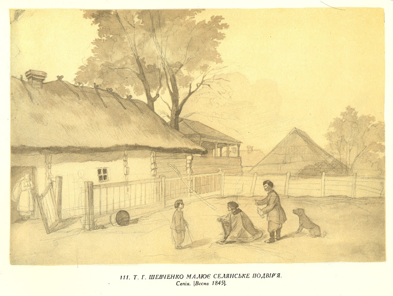 111. Т. Г. Шевченко малює селянське подвір’я. Папір, сепія (18,5 × 27). [Весна 1845].