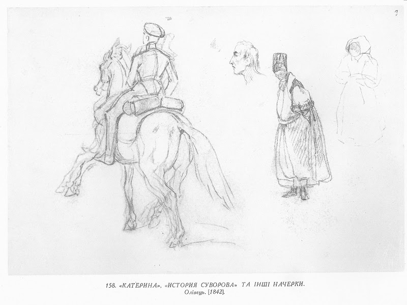 Зліва — кавалерист на коні — етюд до картини Т. Г. Шевченка «Катерина» (див. № 38); справа — голова Суворова (?), чоловік у високій шапці (до ілюстрації «Смерть Потьомкіна» з «Истории Суворова» М. О. Полевого — див. № 52) та начерк жіночої постаті.