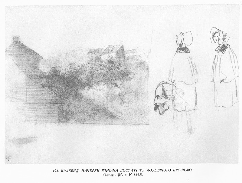 194. Зворот арк. 24. Краєвид, начерки жіночої постаті та чоловічого профілю. Олівець. [Н. р. V 1843].