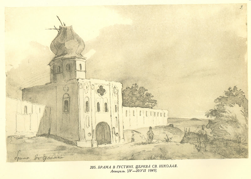 205. Арк. 3. Брама в Густині. Церква св. Ніколая. Акварель. [IV — 20.VII 1845].