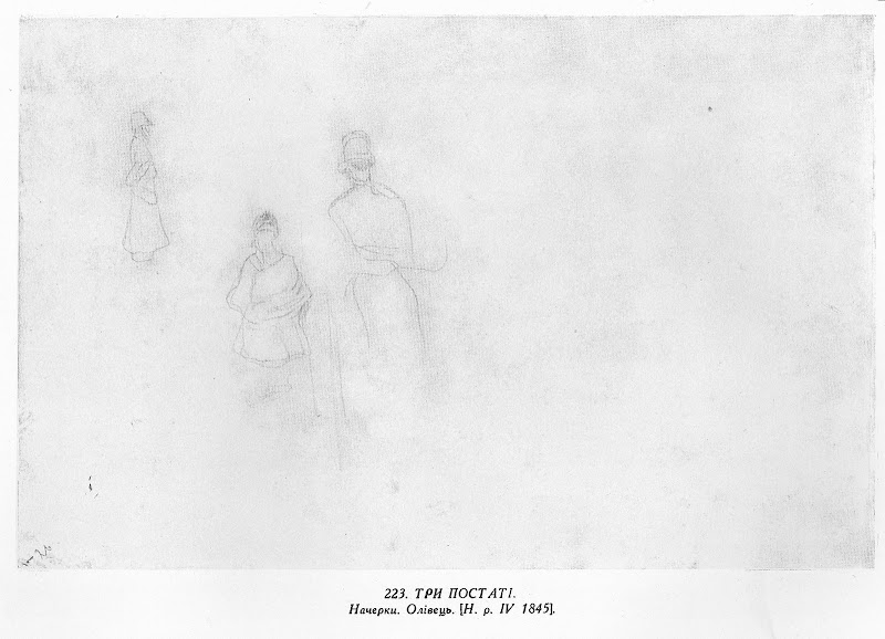 223. Зворот арк. 13. Три постаті. Начерки. Олівець. [Н. р. IV 1845].