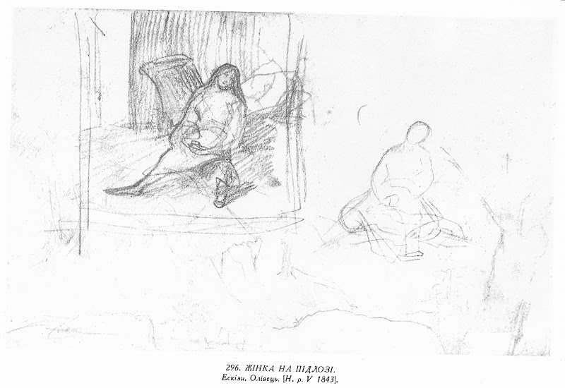 296. Жінка на підлозі. Ескізи. Папір, олівець (14,5 × 23,5). [Н. р. V 1843].