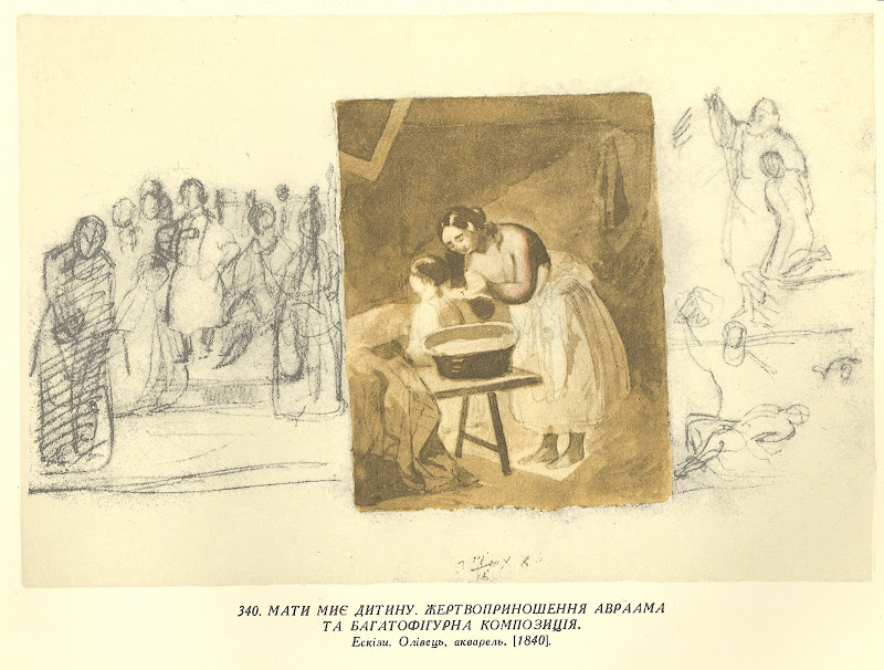В центрі акварельний малюнок «Мати миє дитину». Зліва жанрова сцена, невідомого змісту, справа — два начерки «Жертвоприношення Авраама».