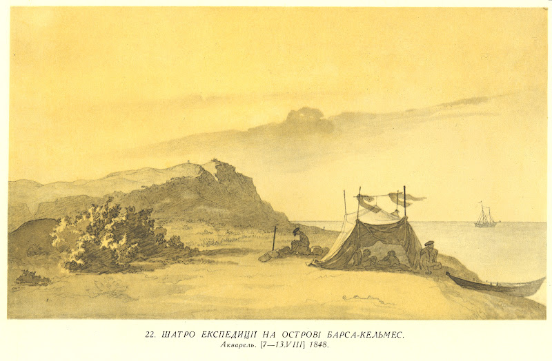 Про це ж пише і Макшеєв: «8-го числа я и Акишев с 8 матросами, взяв с собою провианта на неделю, высадились для осмотра острова и производства на нем полуинструментальной съемки, в масштабах 2-х верст в дюйме, и устроили своє временное жилье из парусины. Между тем шхуна, налившись водою из кудуков, под утро следующего дня снялась с якоря и, пользуясь попутным ветром, направилась снова к полуострову Куланды...» (А. Макшеев, Путешествия по киргизским степям и Туркестанскому краю, СПб., 1896, стор. 62).