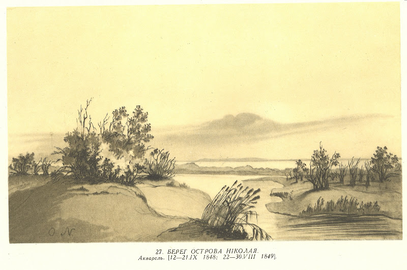 27. Берег острова Ніколая. Папір, акварель (13,8 × 22,9). [12 — 21.IX 1848; 22 — 30.VIII 1849].