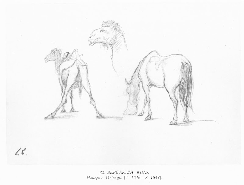 82. Арк. 27. Верблюди. Кінь. Начерки. Олівець. [V 1848 — X 1849].
