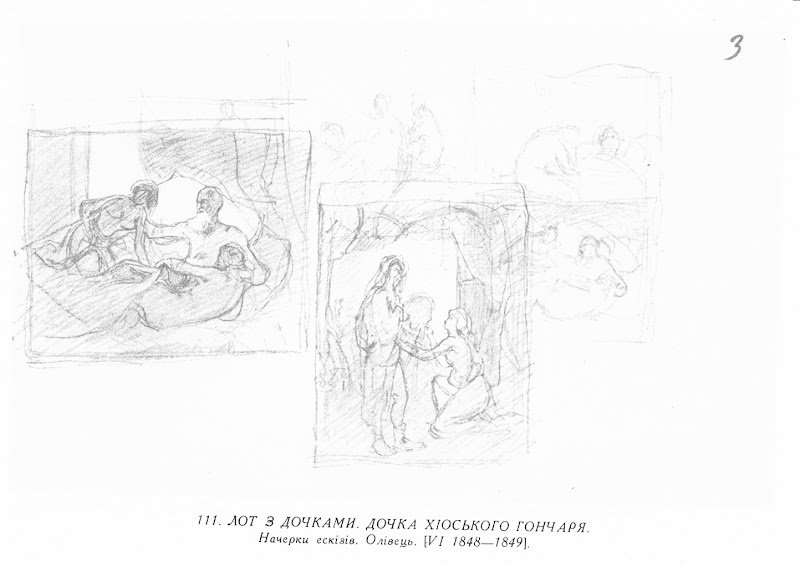 111. Арк. 3. Лот з дочками. Дочка хіоського гончаря. Начерки ескізів. Олівець. [VI 1848 — 1849].