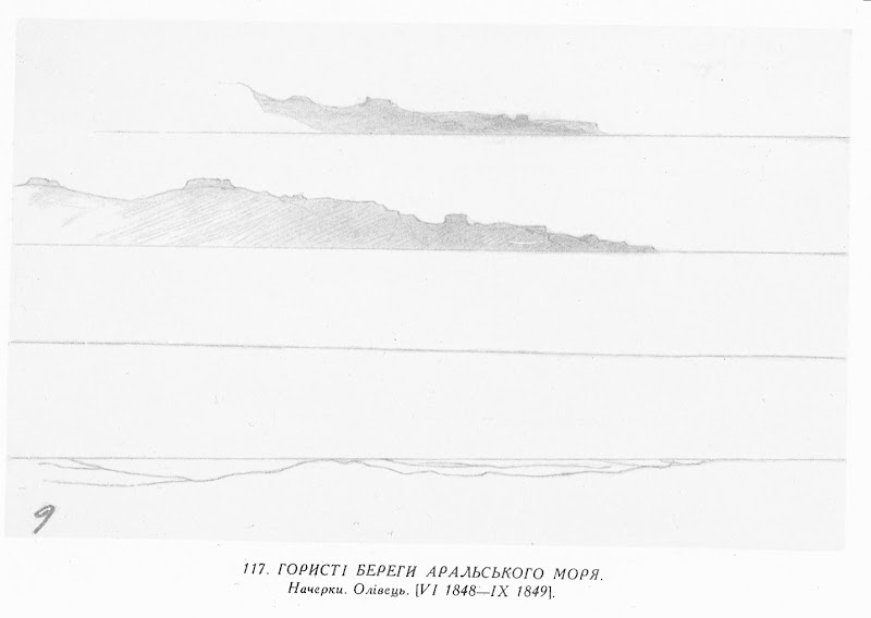 117. Арк. 6. Гористі береги Аральського моря. Начерки. Олівець. [VI 1848 — IX 1849].