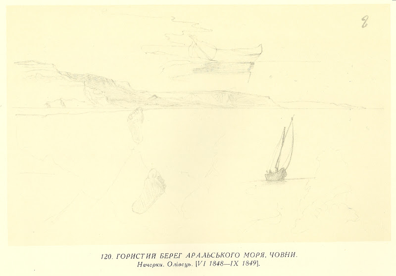 120. Арк. 8. Гористий берег Аральського моря, човни. Начерки. Олівець. [VI 1848 — IX 1849].