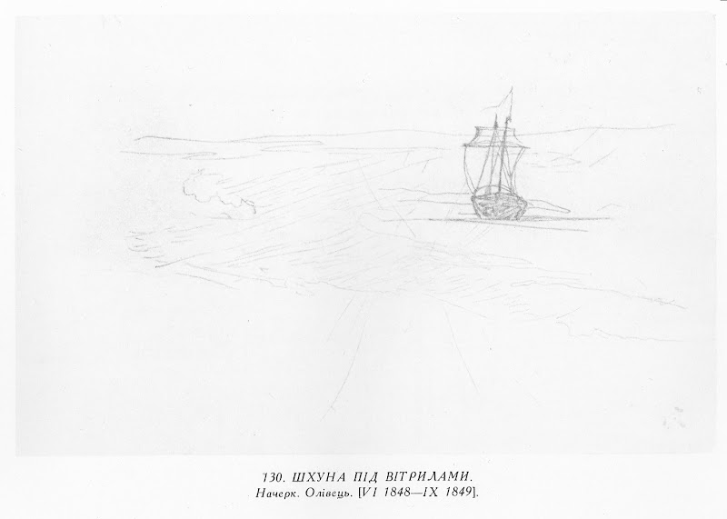 130. Зворот арк. 25. Шхуна під вітрилами. Начерк. Олівець. [VI 1848 — IX 1849].