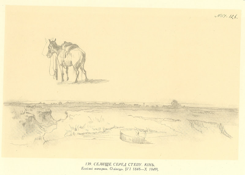139. Селище серед степу. Кінь. Ескізні начерки. Папір, олівець (14,8 × 23). [VI 1848 — X 1849].