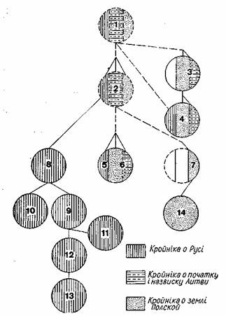 Схема списків і редакцій «Кройніки»: І — Кройніка о Русі; II — Кройніка о початку і назвиску Литви; III — Кройніка о землі Полской.