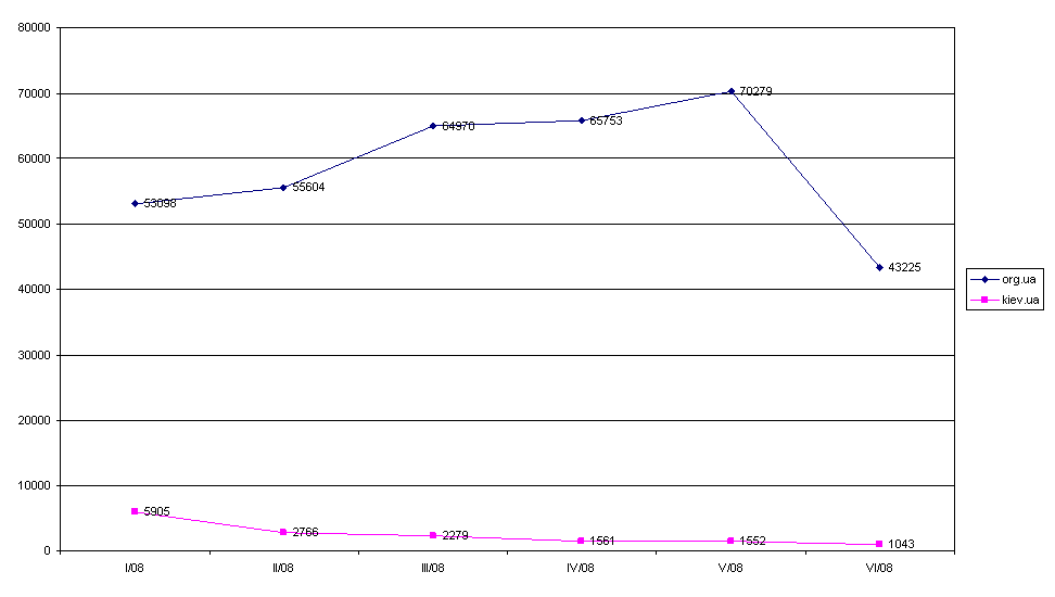 Графік відвідуваності сайту litopys.org.ua та дзеркала за першу половину 2008 року.