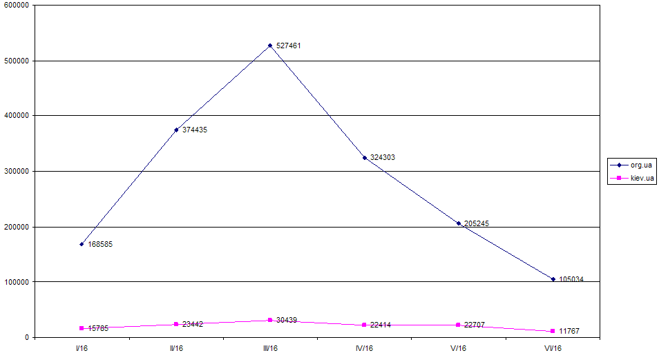 Графік відвідуваності сайту litopys.org.ua та дзеркала за першу половину 2016 року.