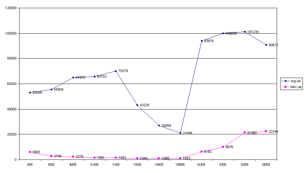 Графік відвідуваності сайту litopys.org.ua та дзеркала за 2008 рік.