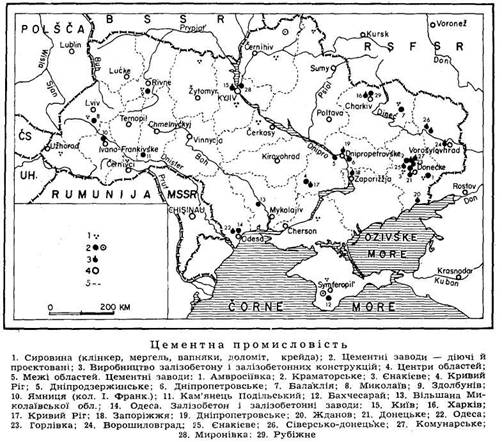 Цементна промисловість, галузь промсти будів. матеріялів, підприємства якої виробляють різні види цементу. Цементна сировини — вапняки, мерґелі, крейда; цементні глини залягають перев. на Донбасі, де знаходиться Амвросіївська група родовищ (одна з найбільших в СССР й у світі), на Харківщині, в Чернігівській, Львівській, Чернівецькій і Рівенській обл. й ін. р-нах УССР. Саме в цих сировинних р-нах розвинулася Ц. п. На Україні перші цементні заводи постали в Амвросіївці (Донецька обл., 1896) і Здолбунові (Рівенська обл., 1898); 1913 їх нараховувалося 12, перев. дрібних, що виробляли 269 000 т цементу (15% випуску Рос. Імперії). Ц. п. розвинулася в роки індустріялізації за перших п’ятирічок з поширенням діючих цементних зав. та побудовою нових у Дніпропетровському, Єнакієвому, Харкові. 1940 в УССР вироблялося 1,2 млн т цементу (20,7% від усього СССР). Після зруйнування в 1941 — 43 підприємства Ц. п. відбудовано і 1948 досягнуто довоєнного рівня продукції; згодом побудовано низку нових, серед яких: цементно-гірничий комбінат у Миколаєві (Львівська обл.) і Балаклеї (Харківська обл.), цементні зав. в Амвросіївці, у Здолбунові, Кривому Розі, Кам’янці Подільському та ін. 1976 Ц. п. нараховувала 15 підприємств, що виробляли 23,1 млн т цементу (18% всесоюзного); все це високоякісний портляндцемент. Найбільшу продукцію (3,8 до 3,9 млн т щороку) випускають зав.: в Балаклії, Амвросіївці і Старокостянтинові. (Див. карту на стор. 3651).